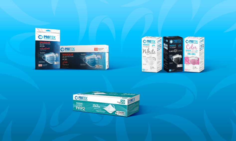 Les masques 3-plis chirurgicaux (14 683) et FFP2 (Norme EN 149) aux normes internationales sont produits sous la marque « Protek » et sont disponibles à travers le territoire national. Il s’agit d’assurer au marché algérien des produits de protection respiratoire de la meilleure qualité et certifiés aux meilleures normes de qualité possibles. Les masques « Protek » sont fabriqués dans une salle blanche avec du matériel de haute technologie, et sont produits en conformité des normes strictes européennes (FFP2). Le tout est accompagné par une certification ISO 13 485 :2016 ainsi qu’une certification CE depuis 2021.